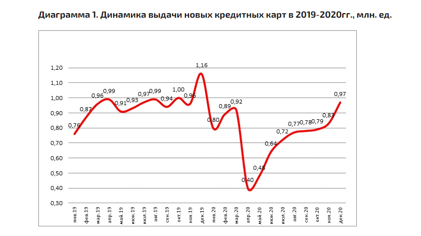 В период карантинных мероприятий весны 2020 года выдача новых кредитных карт по сравнению с аналогичным периодом предыдущего года сократилась больше чем на 60%. При этом в последующем этот сегмент розничного кредитования восстанавливался достаточно умеренными темпами, несколько уступающими темпам выдачи 2019 года», — говорит директор по маркетингу НБКИ Алексей Волков.