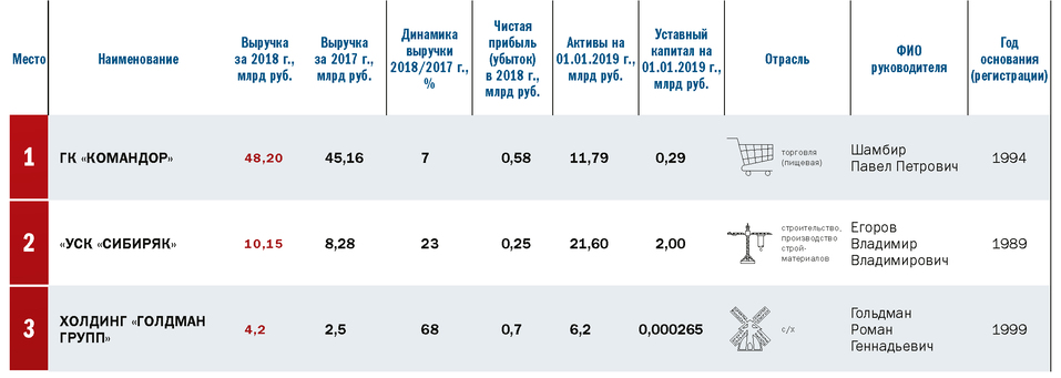 В рейтинге также были раскрыты дополнительные показатели по компаниям: динамика выручки к 2017 г., чистая прибыль в 2018 г., активы на 01.01.2019 г., организационно-правовая форма, ФИО руководителя (в отдельных случаях указано ФИО исполнительного директора или управляющей компании), год основания (в отдельных случаях указан год первичной регистрации компании), место компании в предыдущем рейтинге.