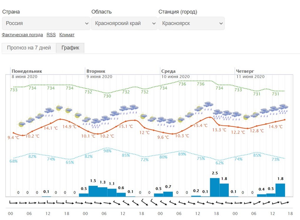 Действительно, по прогнозам Гидрометцентра России эта неделя в Красноярске будет в основном дождливой. Ожидаемый уровень осадков — до 2,5 мм.
