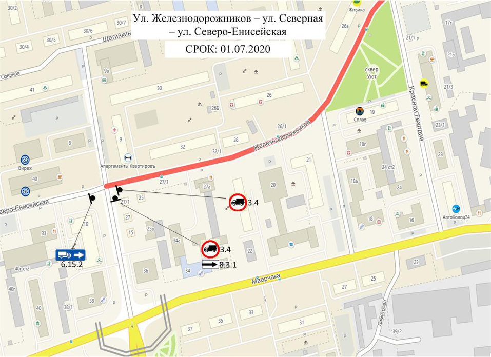Теперь движущимся по улице Север-Енисейская грузовикам нельзя будет проезжать прямо, а придется сворачивать в сторону проспекта Свободный и дальше по Маерчака и Профсоюзов выезжать в центр города. А вот въезд на Железнодорожников со стороны центра остается открытым.