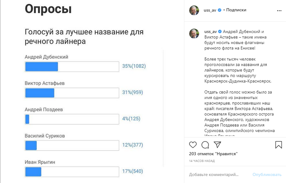 В итоге в выборе имен приняло участие более 3 000 человек. Большинство голосов было отдано за то, чтобы назвать теплоходы именами основателя Красноярского острога Андрея Дубенского (35%) и писателя Виктора Астафьева (31%).