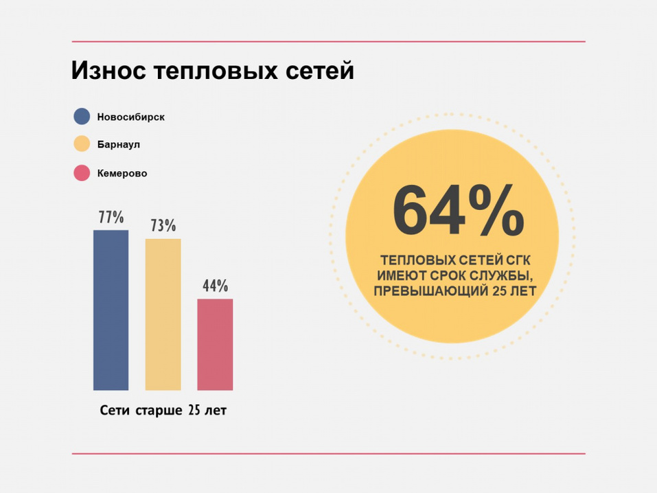 У СГК сейчас на обслуживании более 10 тысяч километров теплосетей, и в целом по регионам присутствия компании 64% сетей с износом выше нормативного. По городам картина разная. Например, из региональных столиц хуже всего в Новосибирске: там 77% теплосетей имеют срок службы выше 25 лет. 73% износ сетей в Барнауле, а вот в Кемерове – 40%, это лучший показатель в Сибири. И по повреждаемости труб лидер Новосибирск, всего за прошедший тепловой сезон по компании зафиксировано порядка 4300 повреждений, более 1600 из них – в Новосибирске, это 38%», - рассказал Александр Григорьев.
