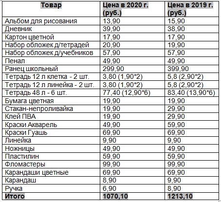 В итоге, несмотря на ежегодную инфляцию и повышение курса валют, базовый набор канцтоваров стал дешевле на 11,8%. В 2020 году его стоимость составила 1070 рублей и 10 копеек, а в 2019 году – 1213 рублей и 10 копеек.