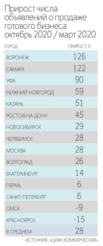 После самоизоляции число объявлений о продаже готового бизнеса в городах-миллионниках выросло в среднем на 28 %, свидетельствуют результаты исследования, проведенного компанией «ЦИАН.Коммерческая», — сообщают «Ведомости».