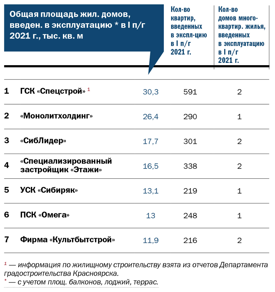 В рейтинге участвуют застройщики жилой недвижимости Красноярска. Учитывались компании, лидирующие по вводу жилья и сдавшие не менее 14,2 тыс. кв. м в 2020 году и не менее 10 тыс. кв. м в I п/г 2021 г.