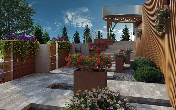 Хотите немного пройтись по «Бульвару цветов»? Начнем от входной зоны — она расположена с южной стороны и преду-сматривает смотровую площадку на уровне 2-го этажа жилого дома, с которой виден весь бульвар. На площадку ведет изящная винтовая лестница. Уже сейчас можно легко предсказать: это место станет популярной локацией для фотосессий.