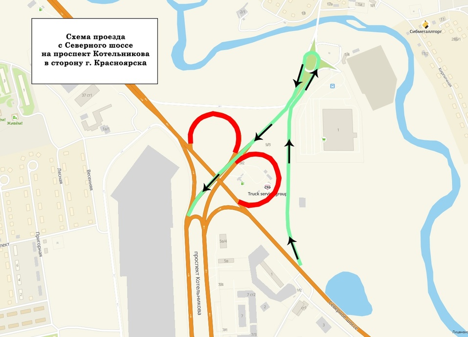 Автомобилистам, которым нужно проехать с проспекта Котельникова в сторону Емельяново, нужно будет ехать в сторону Солонцов до кольца у «Метро», а затем выезжать на трассу.