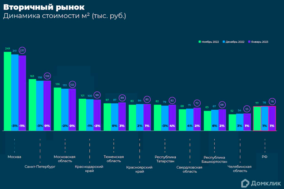 В декабре 2022 цена за один квадратный метр выросла на 2% до 84 тыс. рублей. По прошествии января 2023 квадратный метр вторичного жилья стал дороже еще на 1%, поднявшись до 85 тыс. рублей.