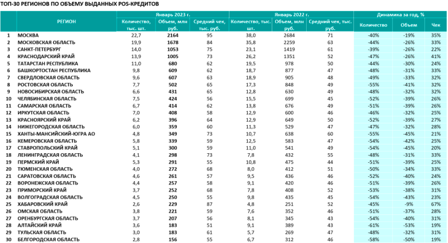 В январе 2023 Красноярский край вошел в топ-30 регионов по объему выданных POS-кредитов: количество кредитов, выданнных для приобретения товаров в красноярских точках продаж, достигло 6,2 тыс. По данным Объединенного кредитного бюро (ОКБ), средний чек составил 64 тыс. рублей, а суммарный объем взятых POS-кредитов — 396 млн рублей.