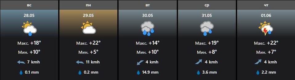 В четверг 1 июня 2023 +22°C, пасмурно, возможна гроза. Ночью +7°C.