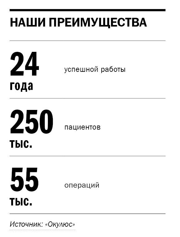 Солидный опыт работы, широкий спектр офтальмологических услуг, «золотой» кадровый состав, уникальные технологии высокотехнологичной медицинской помощи — все это мы консолидируем и работаем каждый день над повышением качества услуг, чтобы наши пациенты могли позаботится о своем зрении с максимальным комфортом», — рассказывает Юлия Долгушева, генеральный директор Центра коррекции зрения «Окулюс».