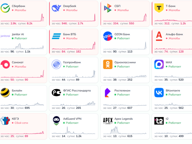 По данным сайта detector404.ru, больше всего жалоб поступает на работу Сбербанка, затем идут Т-Банк, ВТБ и Альфа-Банк. Среди трудностей — невозможно зайти в приложение, сделать перевод, оплатить покупку, снять деньги в банкоматах. О проблемах клиенты сообщают и в пабликах банков.
