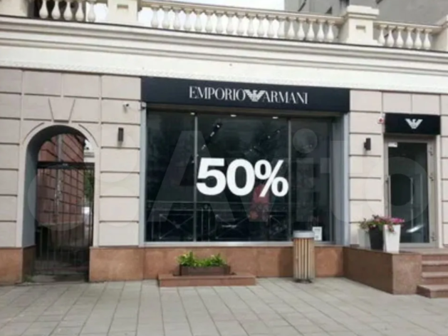 В объявлении указано, что помещение имеет отдельный вход. Его площадь составляет 200 кв. м (по 100 кв. м первый этаж и цоколь). Сделана чистовая отделка. Аренда в месяц — 290 тыс. рублей. Объект сдается минимум на 11М. Арендодатель нам подтвердил, что речь идет о помещении, где сейчас работает «Эмпорио Армани».