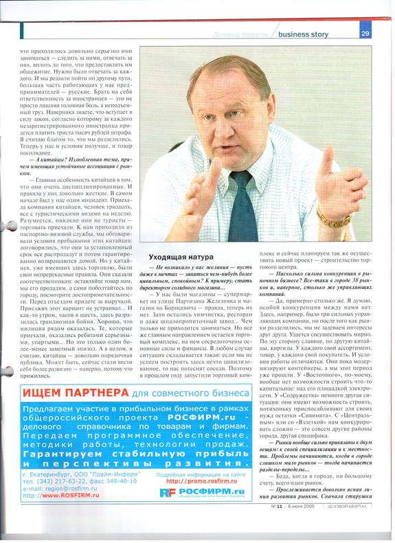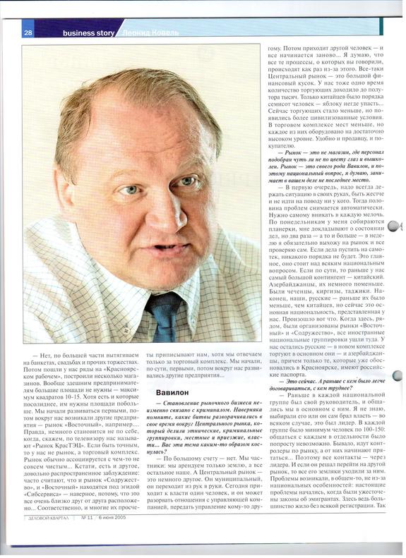 «Можно спорить о том, где имя Леонида Ковеля прозвучало громче – в мире спорта или в бизнесе. Он президент краевой федерации регби, обладатель множества спортивных регалий, в том числе двух медалей чемпиона Советского Союза. Он же президент ООО «Сибсервис» - компании, управляющей самыми разными видами бизнеса, но более всего прославившей себя созданием торгового комплекса «Рынок КрасТЭЦ». Так начинался материал «Рыночное регби» в номере «ДК» почти десятилетней давности. Леонид Ковель по-прежнему у руля краевой регбийной федерации, а вот в его бизнесе есть серьезные перемены.