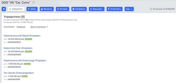 Эта организация тоже была ликвидирована 20 октября 2011 года путем реорганизации, «превратившись» в итоге в ООО «УК. СМ. Сити». Во всяком случае, основные учредители у компаний одни и те же. Их восемь: Юрий Игоревич Коропачинский (36,63%), Олег Игоревич Кириллов (36,63%), Александр Игоревич Коропачинский (10,84%), Артем Александрович Усс (5,95%), Евгений Олегович Ковальский (3,73%), Денис Евгеньевич Васильев (2,84%), Евгений Станиславович Сысойков (2,2%), Александр Иванович Васильев (1,18%).