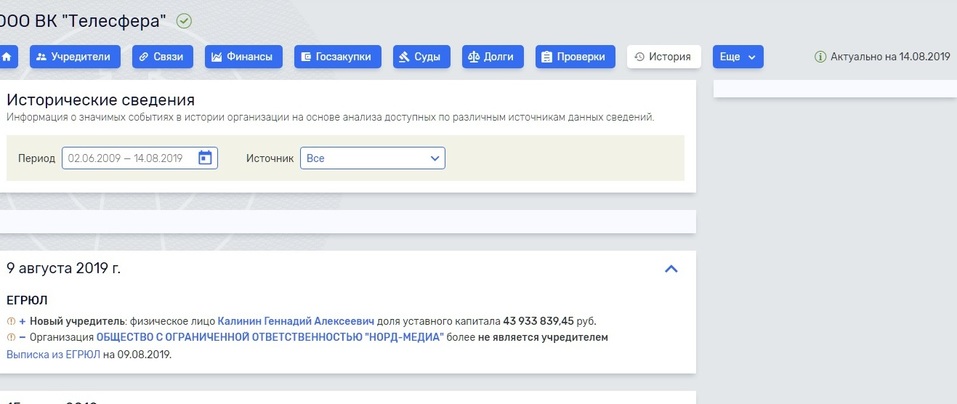 Согласно данным ЕГРЮЛ, новым учредителем ООО ВК «Телесфера» стал Геннадий Калинин с долей уставного капитала 100% или 43 933 839,45 рублей. Изменения в карточку компании были внесены 9 августа. Напомним, ранее учредителем телеканала являлось ООО «Норд Медиа».