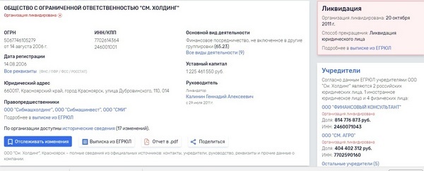 Примечательно, две ликвидированные компании, учредителями в которых значится Геннадий Калинин, — ООО «ФИНАНСОВЫЙ КОНСУЛЬТАНТ» и ООО «СМ. АГРО» — значатся учредителями ООО «СМ. Холдинг».